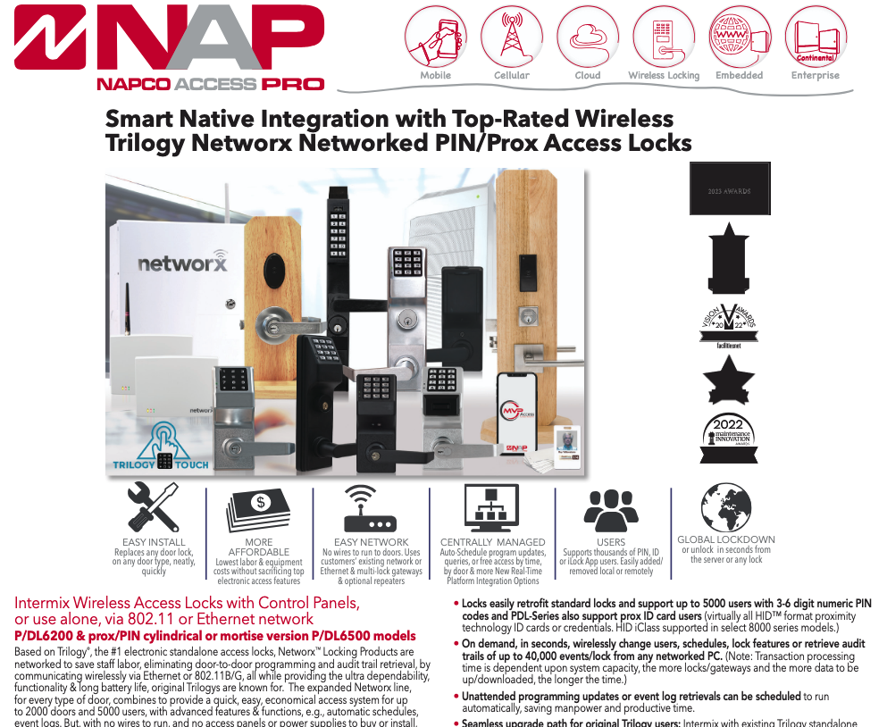 Trilogy Networx is known for being one of the best in its class. Featuring standalone digital, Prox, and classroom lock-down keyfob locks, with HID or iClass Prox readers & wireless networking. With global lockdown in seconds, without door-to-door programming and audit trail queries, you can do it from a lock, server, or keyfob. A Trilogy lock can be installed in less than an hour, allowing you to add wireless access control to one door at a time using Napco Access Pro Platforms.